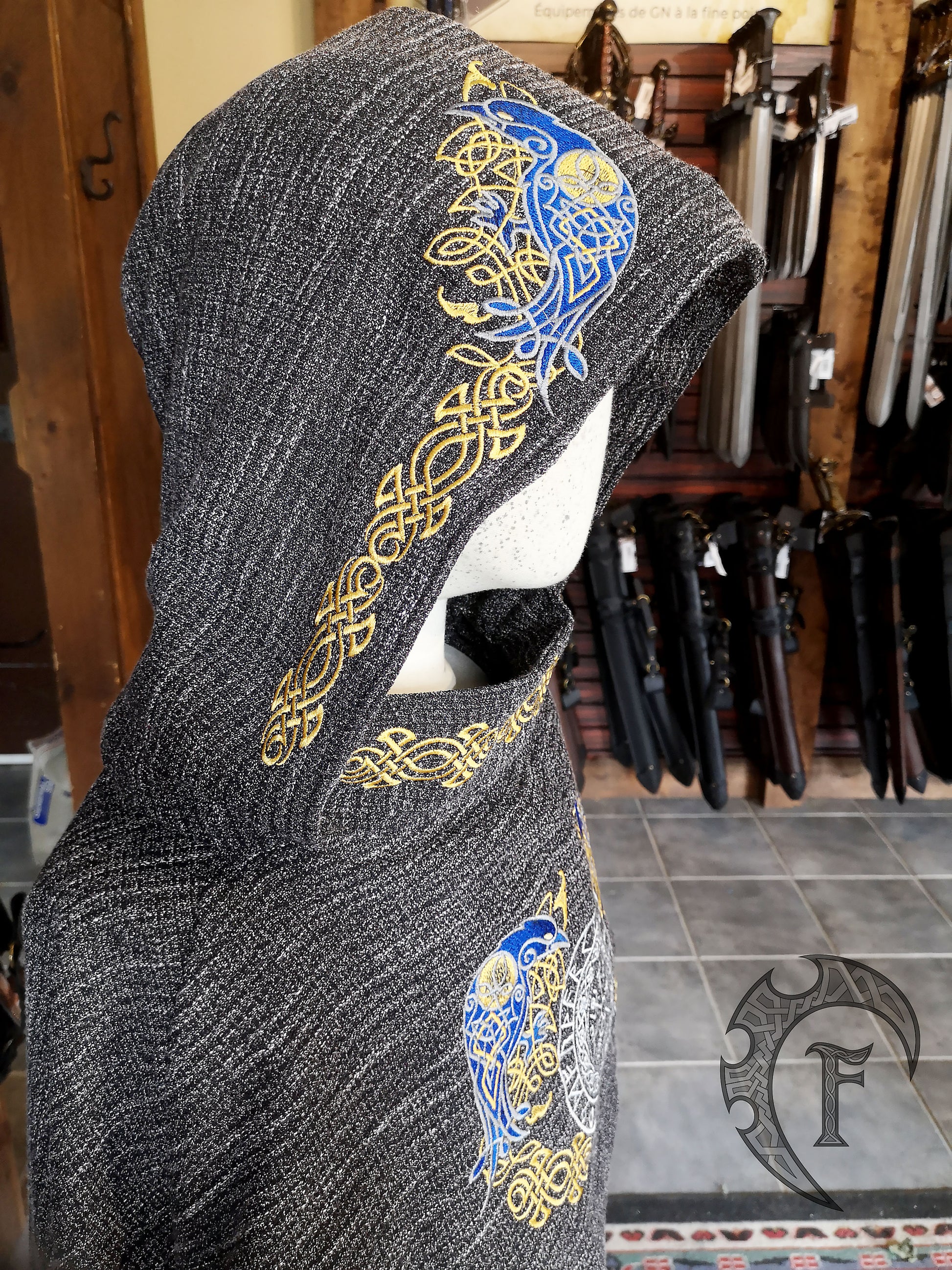 Affichez vos couleurs avec cette incroyable cape inspirée des Vikings ! La broderie complexe du corbeau mélangée au futhark et aux nœuds en font vraiment une pièce unique.