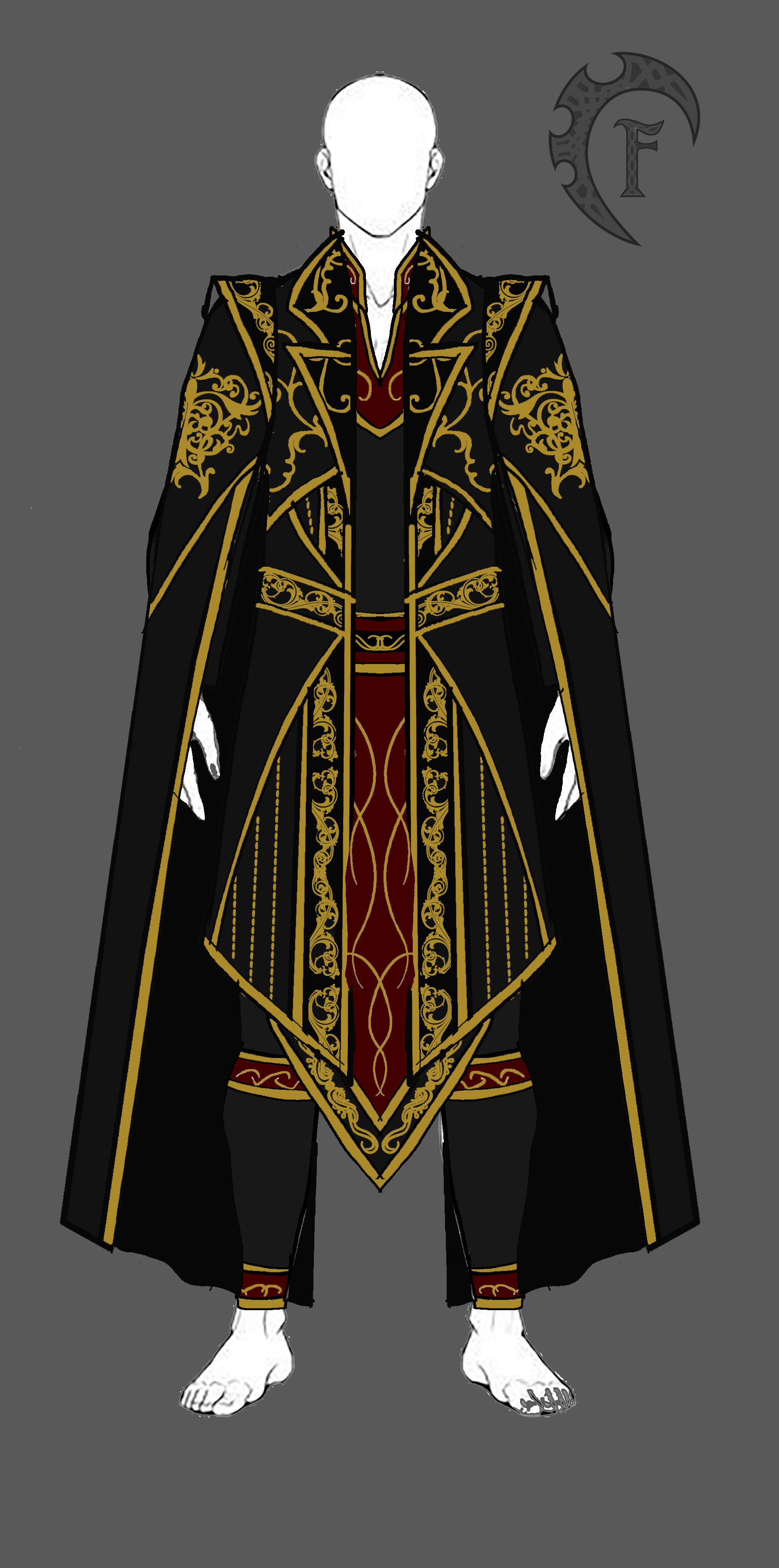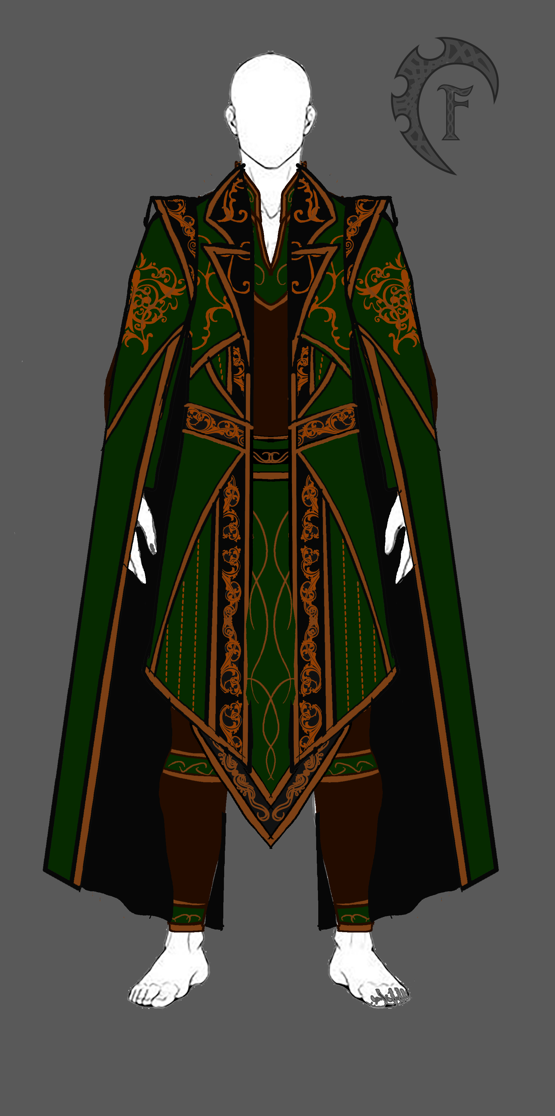 A long coat with cape sleeves, a battle skirt, a shirt, pants